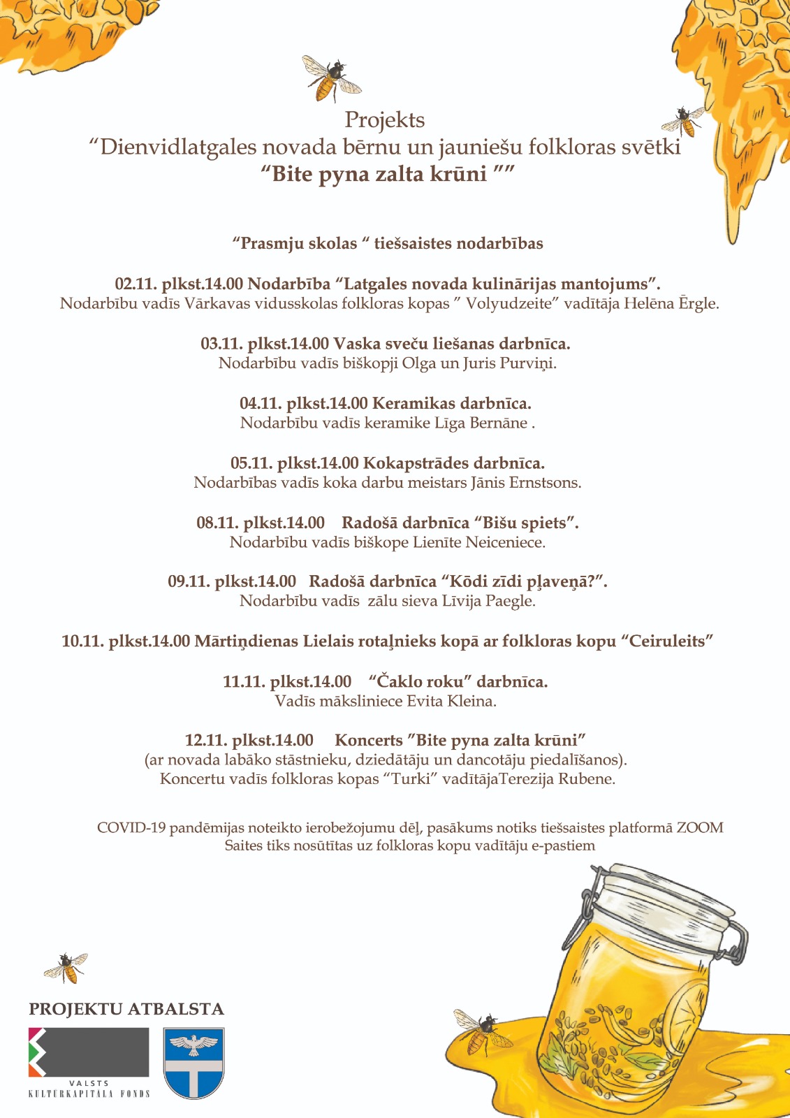 Aizvadīti virtuālie Dienvidlatgales novada bērnu un jauniešu folkloras svētki “Bite pyna zalta krūni”. Šie svētki bija plānoti 2020. gada pavasarī, bet sakarā ar strauju koronavīrusa (Covid-19) izplatīšanos, pasākums tika vairākkārt pārcelts uz citu laiku.