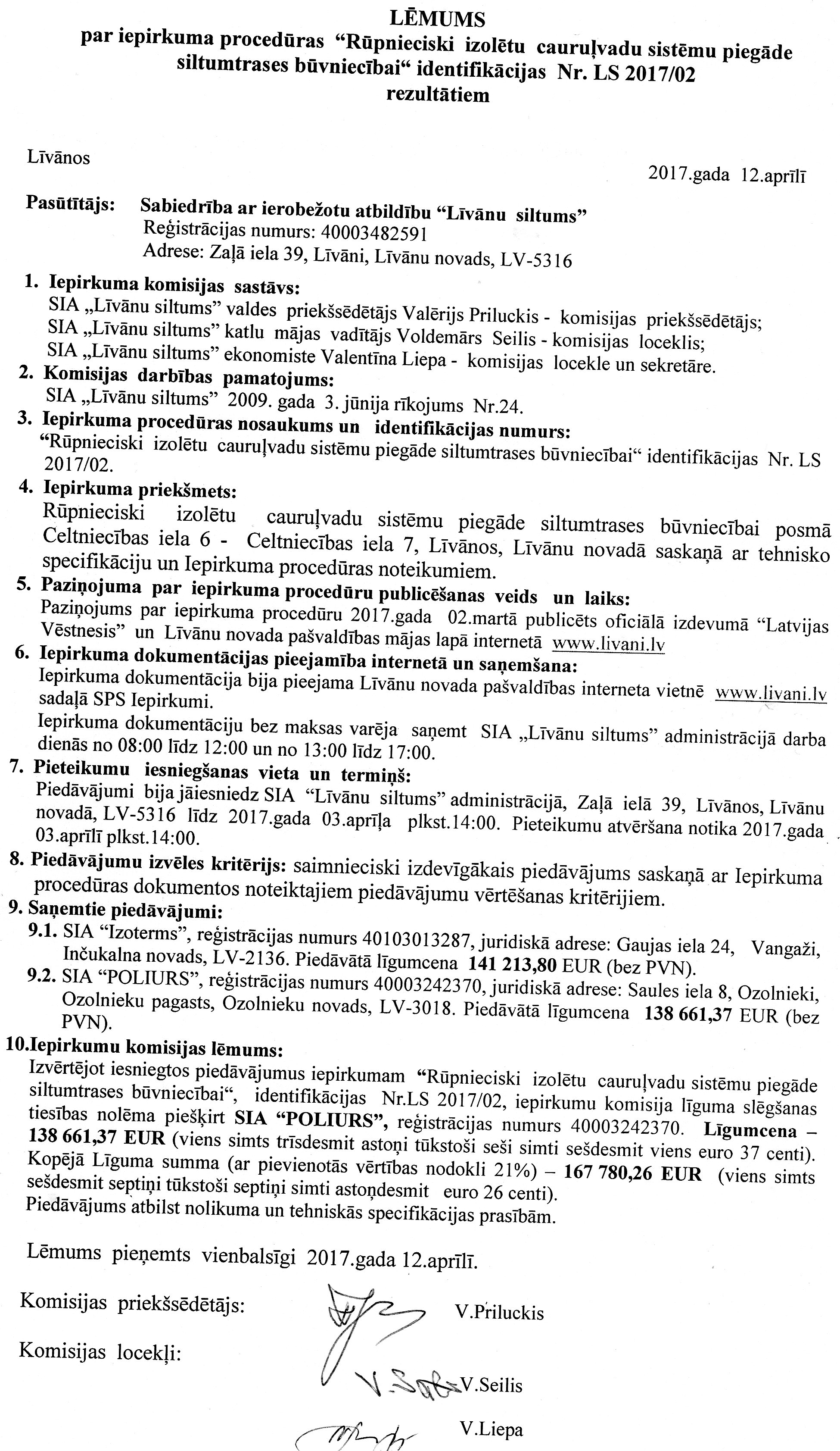 Piegādātājs / izpildītājs: SIA “POLIURS”, reģ.Nr.40003242370