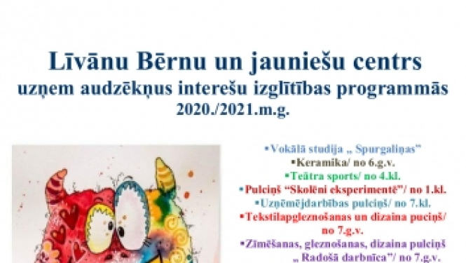 Līvānu Bērnu un jauniešu centrs uzņem audzēkņus interešu izglītības programmās 2020./2021.m.g. Vokālā studija „ Spurgaliņas” Keramika/ no 6.g.v. Teātra sports/ no 4.kl. Pulciņš “Skolēni eksperimentē…