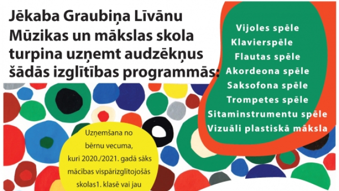 Jēkaba Graubiņa Līvānu Mūzikas un mākslas skola turpina uzņemt audzēkņus šādās izglītības programmās: Vijoles spēle; Klavierspēle; Flautas spēle; Akordeona spēle; Saksofona spēle; Trompetes…