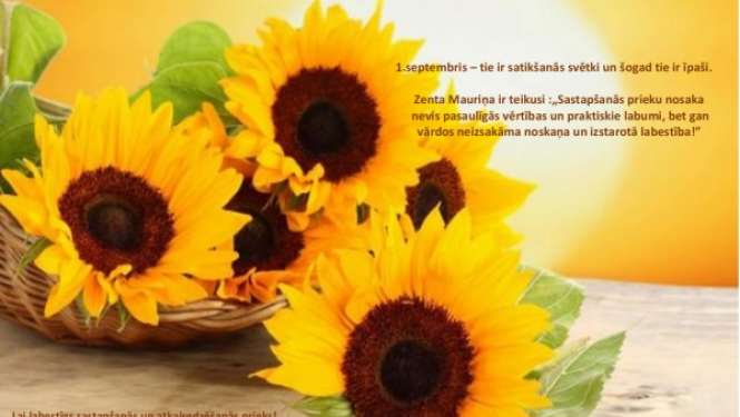 1.septembris – tie ir satikšanās svētki un šogad tie ir īpaši. Zenta Mauriņa ir teikusi :„Sastapšanās prieku nosaka nevis pasaulīgās vērtības un praktiskie labumi, bet gan vārdos neizsakāma noskaņa…