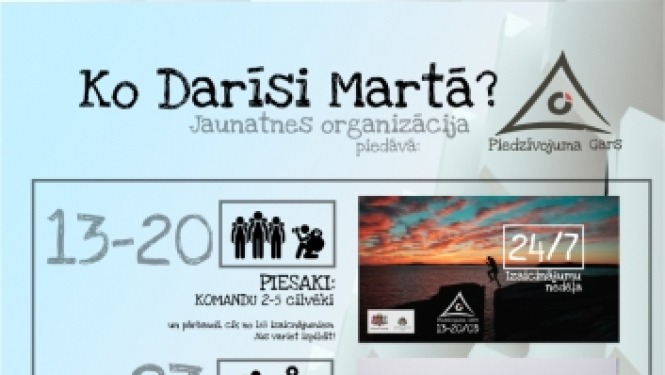 Čau jaunieši! Piedzīvojuma Gars uzņem pavasara jaudu un aicina ielekt vēl marta piedzīvojumos: Skolas brīvlaikā episkākā nedēļa! No 13. līdz 20.martam pieņem 168 izaicinājumus! Piedzīvo prieku,…