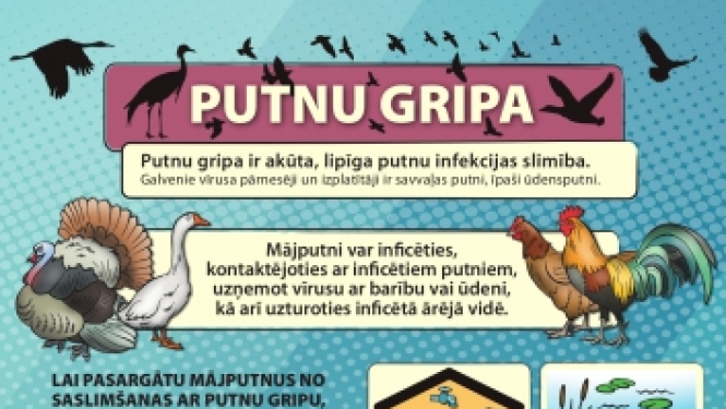 Buklets par putnu gripu PDF formātā Putnu gripa ir akūta, lipīga putnu infekcijas slimība. Galvenie vīrusa pārnesēji un izplatītāji ir savvaļas putni, īpaši ūdensputni. MĀJPUTNI Mājputni var…