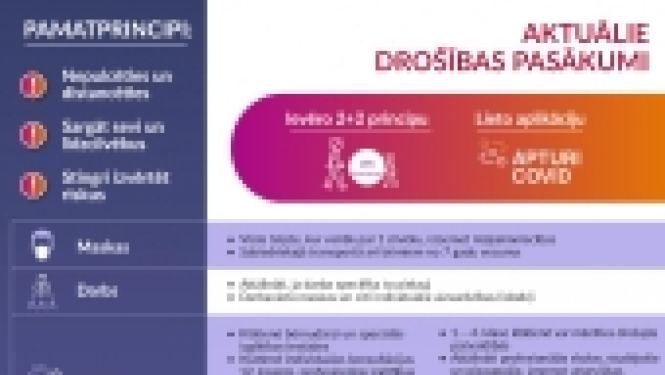 Valsts kanceleja sadarbībā ar nozaru ministrijām ir sagatavojusi vizuālu apkopojumu par aktuālajiem drošības pasākumiem Covid-19 ierobežošanai. Aktuālie drošibas pasākumi (PDF).