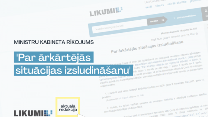 19. februārī iznācis oficiālā izdevuma “Latvijas Vēstnesis” papildu laidiens Nr. 35A ar Ministru kabineta noteikumu un rīkojuma Nr. 655 "Par ārkārtējās situācijas izsludināšanu" oficiālajām…