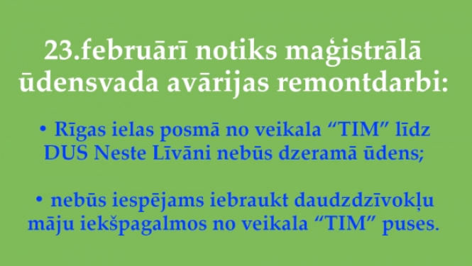 Sakarā ar maģistrālā ūdensvada plīsuma remontdarbiem otrdien, 23.februārī, Rīgas ielas posmā no veikala “TIM” līdz DUS Neste Līvāni nebūs dzeramā ūdens. Darbu norises laikā autovadītājiem nebūs…