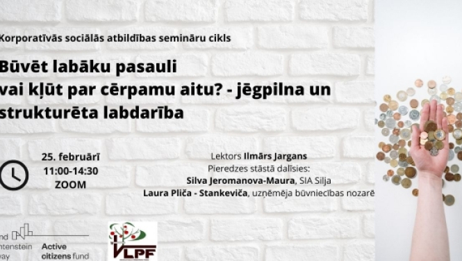 Korporatīvās sociālās atbildības seminārs uzņēmējiem Viduslatgales pārnovadu fonds aicina uzņēmējus un citus interesentus piedalīties seminārā par jēgpilnu un strukturētu labdarību. Pieredzējis…