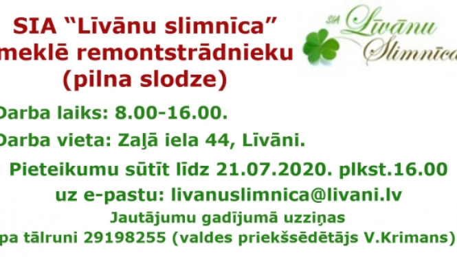 SIA “Līvānu slimnīca” meklē remontstrādnieku (pilna slodze). Darba laiks: 8.00-16.00. Darba vieta: Zaļā iela 44, Līvāni. Pieteikumu nosūtīt līdz 21.07.2020. plkst.16.00 uz e-pastu: livanuslimnica…