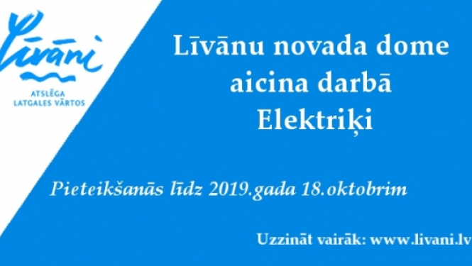 Līvānu novada dome aicina darbā Elektriķi. Galvenie pienākumi: Uzturēt darba kārtībā domes iestāžu ēku elektroinstalācijas tīklus; Veikt elektroietaišu ierīkošanas darbus. Gaismekļu, apgaismes…