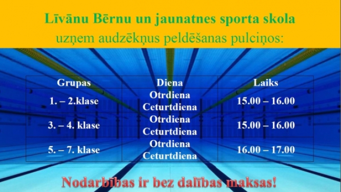 Līvānu Bērnu un jaunatnes sporta skola uzņem audzēkņus peldēšanas pulciņos. Nodarbības ir bez dalības maksas. Sīkāka informācija: klātienē Līvānu BJSS, Rīgas ielā 101, vai pa tālr. 26764718.