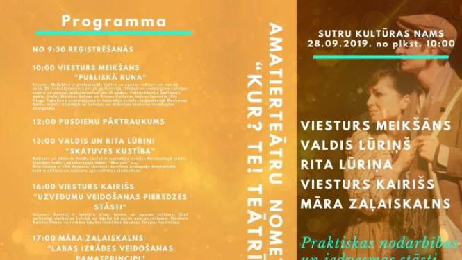 28.septembrī no 10.00 Līvānu novada Sutru kultūras namā norisināsies amatierteātru nometne “Kur? Te! Teātrī!”. Visas dienas laikā praktiskās nodarbības vadīs un labās prakses piemērus stāstīs teātra…