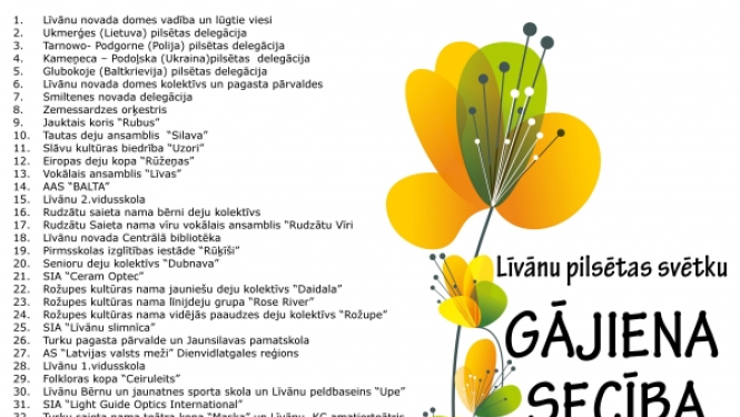 20.jūlijā 19.30 no Līvānu novada Kultūras centra līdz Līvānu pussalai dosies Līvānu pilsētas svētku gājiens. Pulcēšanās gājienam no 19.00 pie Kultūras centra. Gājiena secība.