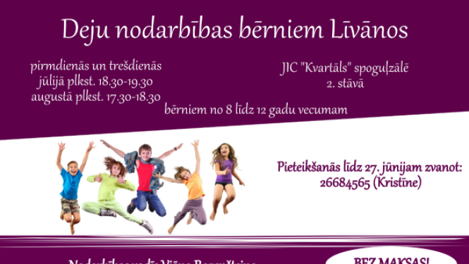 centrā “Kvartāls” notiks bezmaksas deju nodarbības bērniem vecumā no 8 līdz 12 gadiem. Nodarbības plānotas divas reizes nedēļā, pirmdienās un trešdienās. Pirmās nodarbības sākums 1. jūlijā. Nodarbību…
