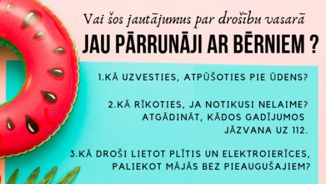 Pavisam drīz sāksies skolēnu brīvlaiks, tādēļ Valsts ugunsdzēsības un glābšanas dienests (VUGD) aicina vecākus pārrunāt ar bērniem piecus jautājumus par drošību, lai vasara būtu piedzīvojumiem bagāta…
