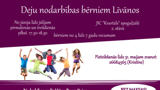 No jūnija līdz jūlijam Līvānu novada Multifunkcionālajā jaunatnes iniciatīvu centrā “Kvartāls” notiks bezmaksas deju nodarbības bērniem vecumā no 4 līdz 7 gadiem. Nodarbības plānotas divas reizes…