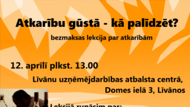 12. aprīlī plkst. 13.00 – 14.30 Līvānu uzņēmējdarbības atbalsta centrā, Domes ielā 3 norisināsies lekcija kopā ar psiholoģi Nadeždu Balodi. Lekcijā tiks runāts par: alkohola, tabakas un narkotiku…