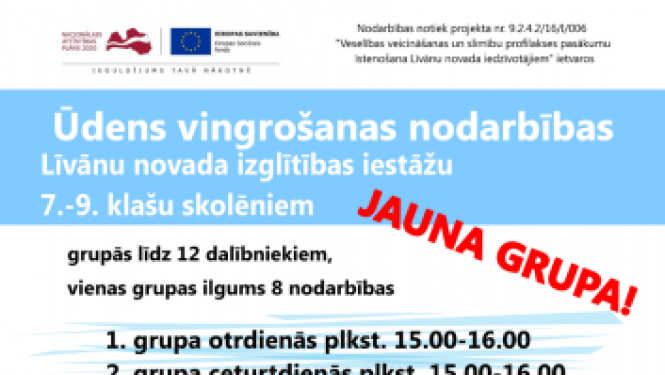 19. un 21. martā ir iespēja pievienoties jaunajām grupām Līvānu peldbaseinā uz ūdens vingrošanas nodarbībām 7.-9. klašu skolēniem pie peldēšanas trenera Indara Mucenieka. Nodarbības norisināsies…