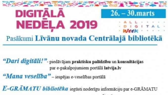 No 26. - 30. martam Līvānu novada Centrālajā bibliotēkā norisināsies digitālā nedēļa 2019. Interesentiem būs iespēja saņemt praktisku palīdzību un konsultācijas par e-pakalpojumiem portālā latvija.lv…