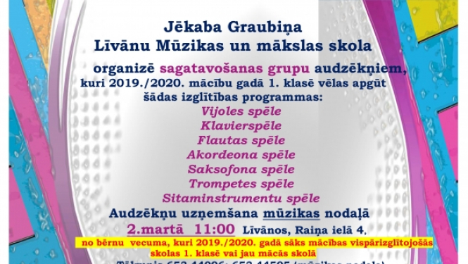 Jēkaba Graubiņa Līvānu Mūzikas un mākslas skola organizē sagatavošanas grupu audzēkņiem, kuri 2019./2020. mācību gadā 1. klasē vēlas apgūt šādas izglītības programmas: Vijoles spēle; Klavierspēle;…