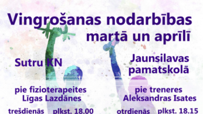 Martā un aprīlī notiks bezmaksas vingrošanas nodarbības pieaugušajiem Sutru KN un Jaunsilavas pamatskolā. Jaunsilavas pamatskolas svinību zālē vingrošanas nodarbības notiks pie fitnesa treneres…