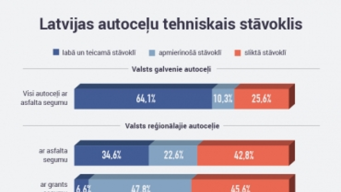 Pēc 2018. gadā veiktajiem remontdarbiem valsts autoceļu tīklā 64,1 % galveno autoceļu ir labā un teicamā tehniskajā stāvoklī. Visi valsts galvenie autoceļi ir ar asfaltbetona segumu. 10,3 % valsts…