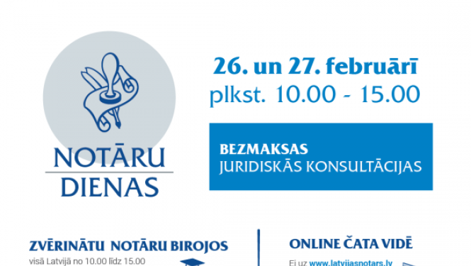 Notāru dienas, kad visā Latvijā zvērināti notāri sniegs bezmaksas juridiskās konsultācijas, šogad notiks 26. un 27. februārī. Iedzīvotāji aicināti vērsties pie zvērinātiem notāriem, lai saņemtu…