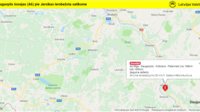 Uz Daugavpils šosejas (A6) Jersikas pagastā pie Āriņiem (188,21. km) ceļa segumā rišu padziļinājumos šorīt ir izveidojušās bedres, tāpēc atļautais braukšanas ātrums apmēram 200 metru garā joslā tur…