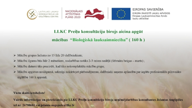 LLKC Preiļu konsultāciju birojs aicina apgūt mācības “Bioloģiskā lauksaimniecība” (160 h) Mācību grupas lielums no 15 līdz 20 dalībniekiem; Mācību ilgums būs līdz 2 mēnešiem, nodarbības notiks 2-3…