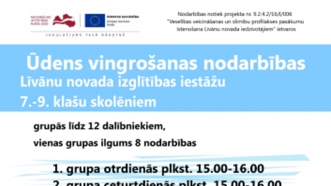 No 15. janvāra otrdienās un ceturtdienās plkst. 15.00-16.00 notiks bezmaksas peldēšanas nodarbības Līvānu novada izglītības iestāžu 7.-9. klases skolēniem. Ūdens vingrošanu vadīs profesionāls…