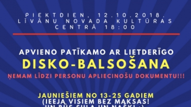 Ja Tev ir 13 – 25 gadi, tad STOP – izlasi šo! PIEKTDIEN, 12.10.2018. Līvānu novada Kultūras centrā 18:00 - apvieno patīkamo ar lietderīgo un piedalies DISKO-BALSOŠANĀ (ieeja visiem bez maksas!) …