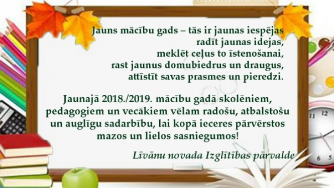 Jauns mācību gads-tās ir jaunas iespējas radīt jaunas idejas, meklēt ceļus to īstenošanai, rast jaunus domubiedrus un draugus, attīstīt savas prasmes un pieredzi. Jaunajā 2018./2019. mācību gadā…