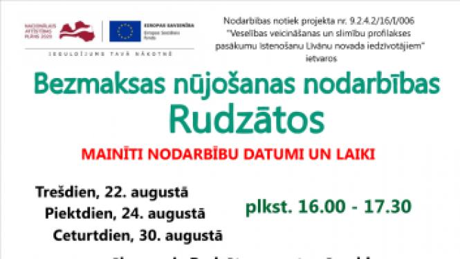 Augustā projekta nr. 9.2.4.2/16/I/006 „Veselības veicināšanas un slimību profilakses pasākumu īstenošana Līvānu novada iedzīvotājiem” ietvaros notiek nūjošanas nodarbības Rudzātos. Sākums pie…