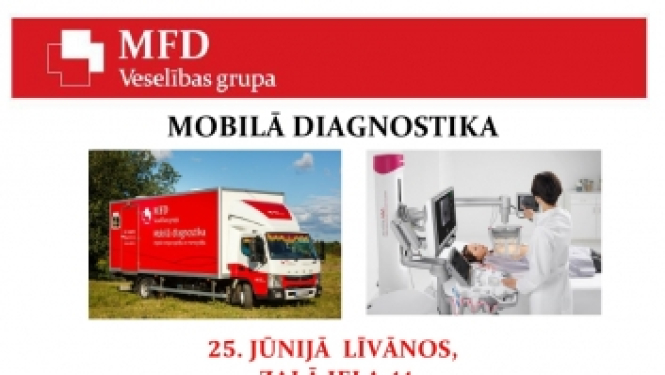 Pirmdien, 25. jūnijā, 10.00 – 17.00 pie Līvānu slimnīcas (Zaļā iela 44, Līvāni) būs pieejami mobilās diagnostikas izmeklējumi. Mamogrāfija: Ar Nacionālā veselības dienesta (NVD) uzaicinājuma vēstuli…