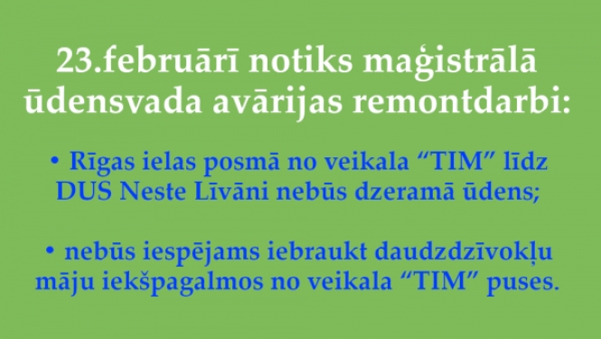 Sakarā ar maģistrālā ūdensvada plīsuma remontdarbiem otrdien, 23.februārī, Rīgas ielas posmā no veikala “TIM” līdz DUS Neste Līvāni nebūs dzeramā ūdens. Darbu norises laikā autovadītājiem nebūs…