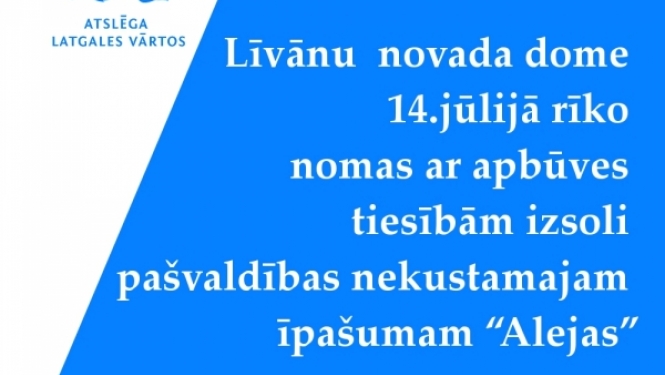 Līvānu novada dome 2020.gada 14.jūlijā plkst. 14.00 Līvānu uzņēmējdarbības atbalsta centrā konferenču zālē, 206.telpā, Domes ielā 3, Līvānos, rīko nomas ar apbūves tiesībām mutisku izsoli ar…