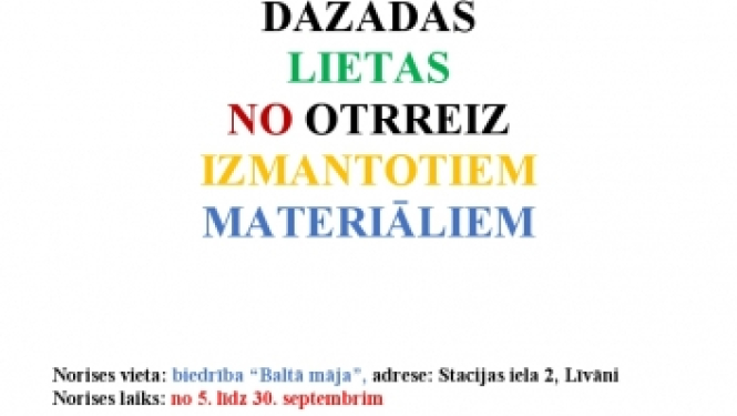 No 5. līdz 30.septembrim biedrības “Baltā māja” telpās, Stacijas iela 2, Līvāni, apskatāma izstāde “No jauna radīts”. Dažādas lietas no otrreiz izmantotiem materiāliem. Pasākums notiek projekta “Kopā…