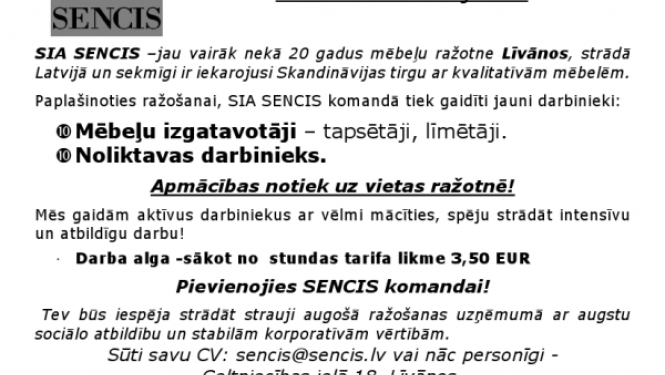 Darba sludinājums SIA SENCIS –jau vairāk nekā 20 gadus mēbeļu ražotne Līvānos, strādā Latvijā un sekmīgi ir iekarojusi Skandināvijas tirgu ar kvalitatīvām mēbelēm. Paplašinoties ražošanai, SIA…