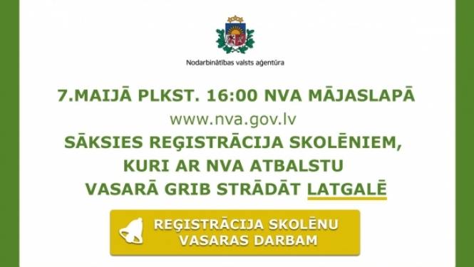 Nodarbinātības valsts aģentūras (NVA) mājaslapā maijā sāksies skolēnu elektroniskā reģistrācija dalībai NVA īstenotajos “Nodarbinātības pasākumos vasaras brīvlaikā personām, kuras iegūst izglītību…