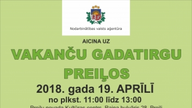 19. aprīlī no plkst.11:00 līdz 13:00 Preiļu novada Kultūras centrā (Raiņa bulvāris 28, Preiļi) norisināsies Nodarbinātības valsts aģentūras (NVA) Vakanču gadatirgus, kurā brīvās darba vietas darba…