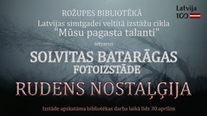 Rožupes bibliotēkā Latvijas simtgadei veltītā izstāžu cikla “Mūsu pagasta talanti” ietvaros Solvitas Batarāgas fotoizstāde “Rudens nostaļģijas”. Izstāde apskatāma bibliotēkas darba laikā līdz 30…