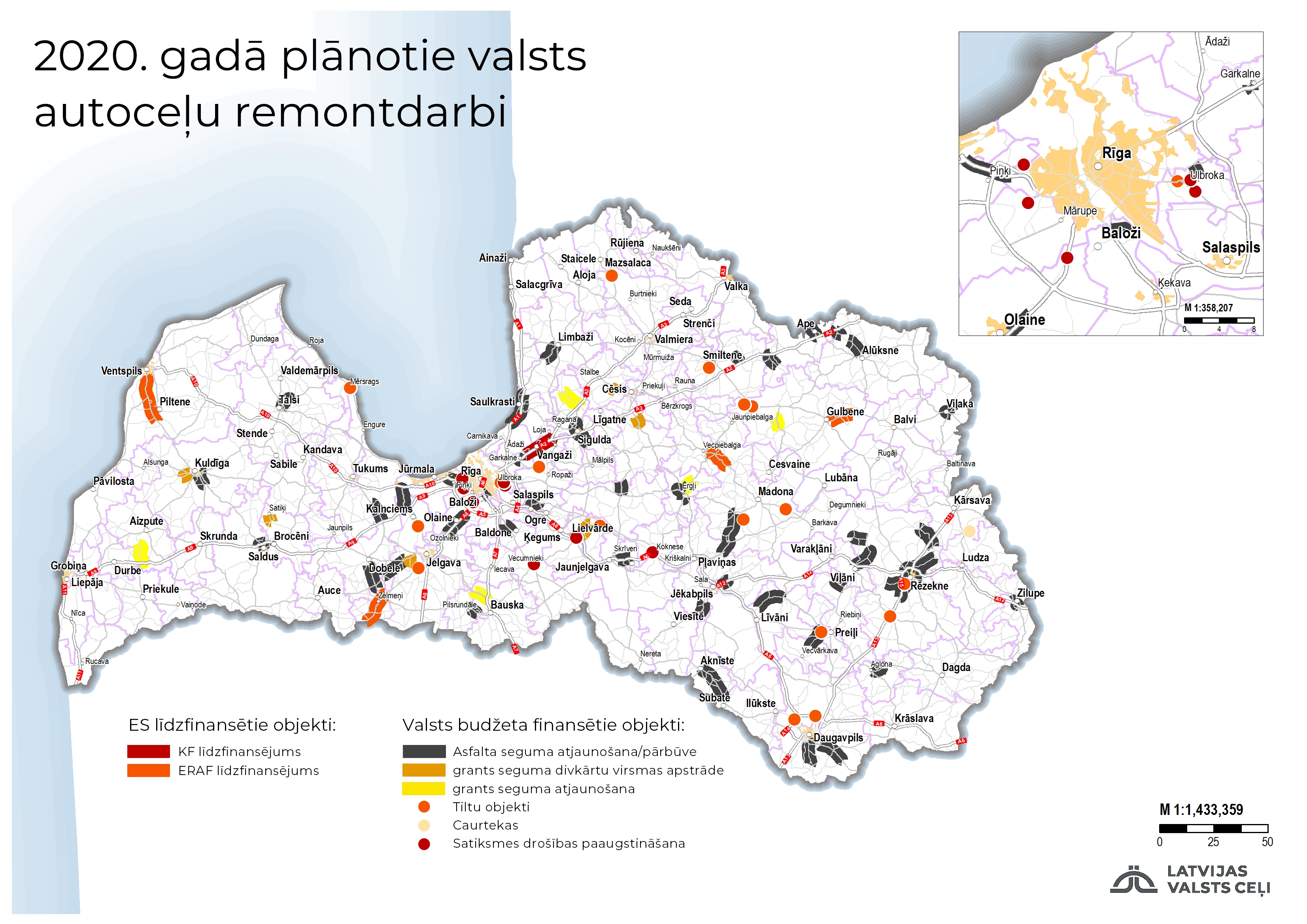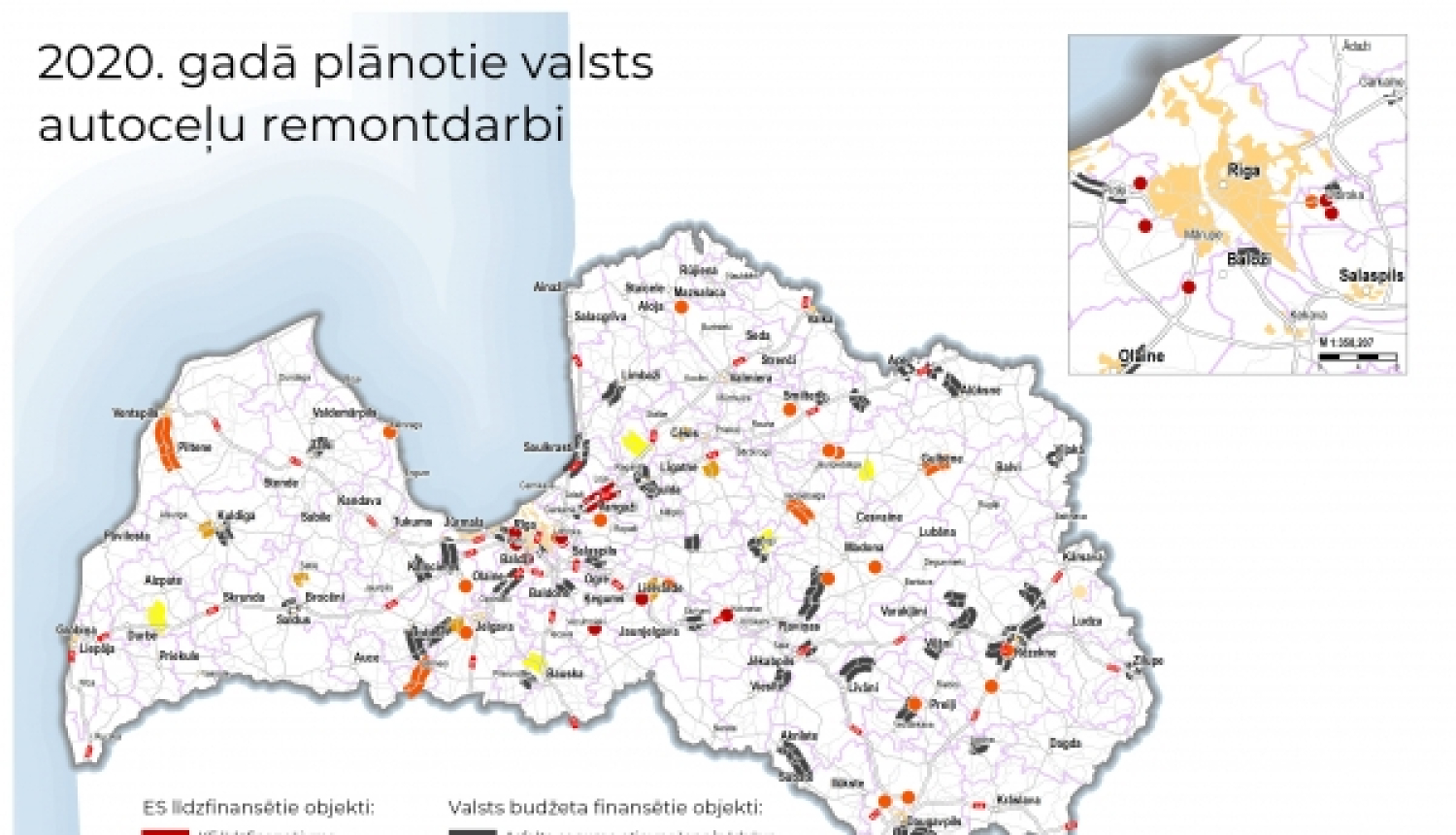 2020. gadā valsts autoceļu tīklā kopumā darbi plānoti 101 objektā, no kuriem 33 objekti ir pārejoši no 2019. gada. Darbi, tai skaitā, noritēs uz desmit valsts galveno autoceļu posmiem, 45 reģionālo un 20 vietējo autoceļu posmiem. Pagājušajā gadā darbi valsts ceļu tīklā noritēja 99 objektos 800 kilometru kopgarumā. Kapitālieguldījumus šogad plānots veikt 477 km autoceļu, kas ir tādā pašā apjomā kā 2019. gadā.