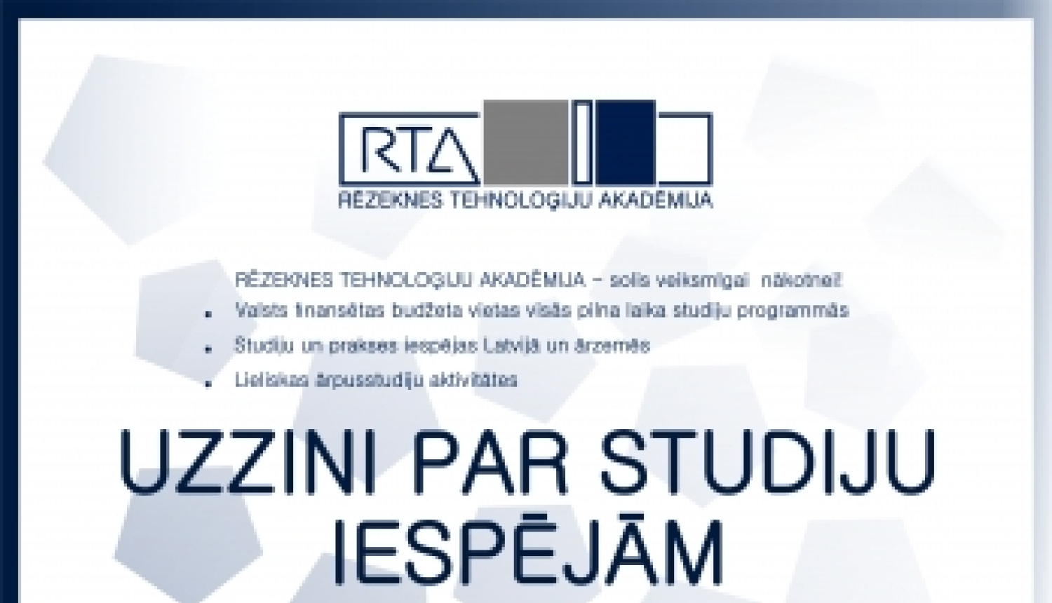 Piektdien, 5. aprīlī, Rēzeknes Tehnoloģiju akadēmijā (RTA), Atbrīvošanas alejā 115, Rēzeknē plkst. 10.00 interesenti gaidīti Informācijas dienā. Tā ir lieliska iespēja individuāli vai vidusskolu klašu grupā kopā ar audzinātāju doties uz Rēzekni, lai pārliecinātos, ka ikvienam, kurš ieguvis vidējo izglītību, ir iespēja kļūt par RTA studentu.