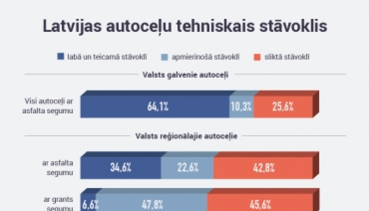 Pēc 2018. gadā veiktajiem remontdarbiem valsts autoceļu tīklā 64,1 % galveno autoceļu ir labā un teicamā tehniskajā stāvoklī. Visi valsts galvenie autoceļi ir ar asfaltbetona segumu. 10,3 % valsts galveno autoceļu ir apmierinošā stāvoklī un vēl 25,6 % – sliktā tehniskā stāvoklī.