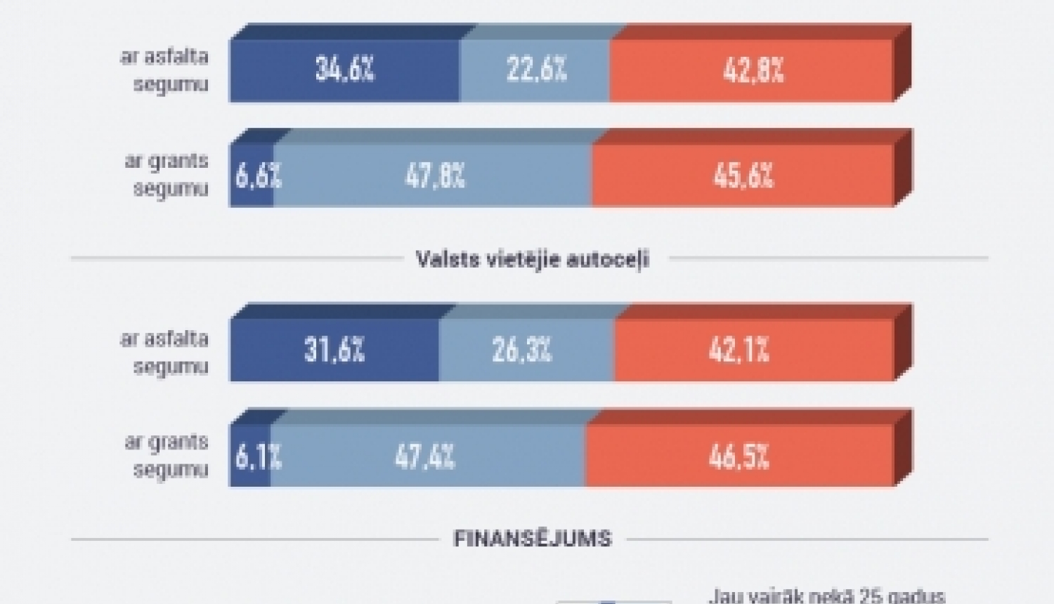 Lai veiktu nepieciešamos darbus valsts autoceļu tīklā, katru gadu ir nepieciešami 636 miljoni eiro. Jau vairāk nekā 25 gadus valsts autoceļu tīkls tiek uzturēts nepietiekama finansējuma apstākļos, tāpēc ir izveidojies neizdarīto darbu deficīts 4 miljardu eiro apmērā. Kā sekas liela daļa valsts pārziņā esošo autoceļu ir sliktā un ļoti sliktā tehniskajā stāvoklī.