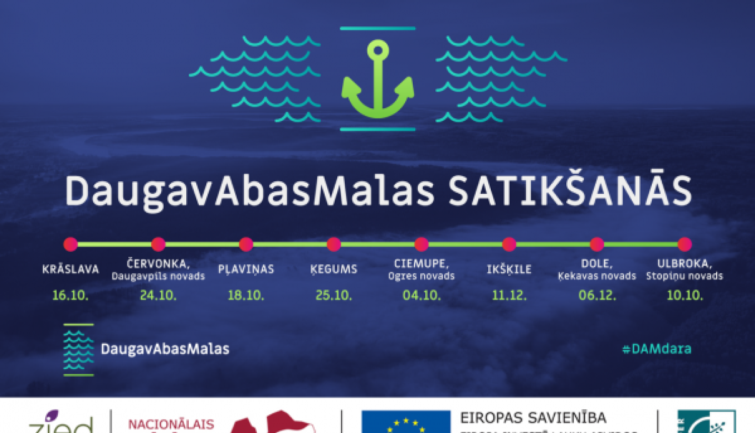 Kopumā oktobrī un decembrī notiks 8 “DaugavAbasMalas” satikšanās, un katrai no konferencēm ir sava tēma, kas dos iespēju iedziļināties plašā jautājumu klāstā un risināt specifiskām mērķa grupām aktuālas problēmas. Pirmā konference norisināsies 4.oktobrī Ogres novadā, kur tiks iezīmēti kopīgi veicamie darbi. Otrā konference notiks 10.oktobrī Stopiņu novadā, un tajā tiks diskutēts par NVO lomu un iespējām Daugavas baseinā. Trešā daugaviešu satikšanās būs veltīta tūrisma nozarei, un tā norisināsies 16.oktobrī Krāslavas novadā. 18.oktobrī Pļaviņu novadā, “DaugavAbasMalas” ceturtajā konferencē, aicināti pulcēsies Daugavas baseina pašvaldību vadītāji, savukārt uz piekto konferenci 24.oktobrī Daugavpils novadā īpaši tiek gaidīti pētnieki, stratēģi un attīstības politikas plānotāji. Sestā daugaviešu satikšanās vieta būs Ķeguma novadā 25.oktobrī, kur tiek ielūgti jaunatnes NVO un jauniešu interešu grupas. Uz pirmspēdējo konferenci 6.decembrī Ķekavas novadā tiek gaidīti vides speciālisti. Daugaviešu satikšanās noslēgsies 11.decembrī Ikšķiles novadā ar kopīgu visu konferenču rezultātu izvērtēšanu un turpmāko rīcību noteikšanu.