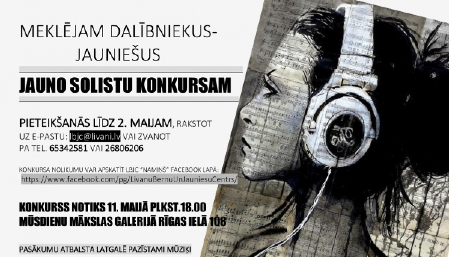 Līvānu Bērnu un jauniešu centrs aicina Līvānu novada izglītības iestāžu skolēnus (6. - 12. klase) līdz šī gada 2. maijam pieteikties Jauno solistu konkursam, kas norisināsies 11.maijā plkst. 18.00 Mūsdienu mākslas galerijas telpās, Līvānos.