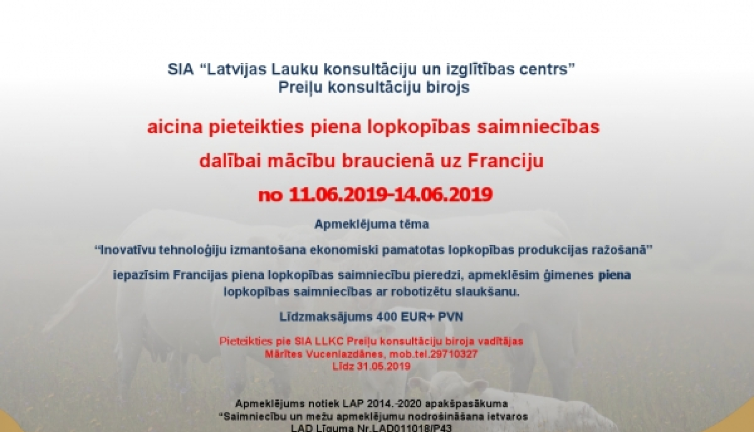 SIA “Latvijas Lauku konsultāciju un izglītības centrs” Preiļu konsultāciju birojs aicina pieteikties piena lopkopības saimniecības dalībai mācību braucienā uz Franciju no 11.06.2019 līdz 14.06.2019. Apmeklējuma tēma: “Inovatīvu tehnoloģiju izmantošana ekonomiski pamatotas lopkopības produkcijas ražošanā”. Iepazīsim Francijas piena lopkopības saimniecību pieredzi, apmeklēsim ģimenes piena lopkopības saimniecības ar robotizētu slaukšanu.