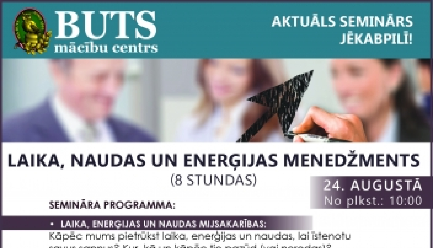 Piektdien, 24. augustā plkst. 11.00 SIA "BUTS" aicina visus interesentus uz semināru "Laika, naudas un enerģijas menedžments", kas norisināsies Jēkabpilī, Nākotnes ielā 2.