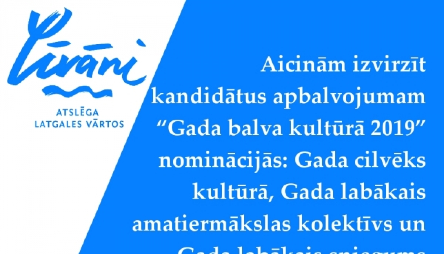 Aicinām līdz 2020. gada 17. janvārim izvirzīt kandidātus apbalvojumam Līvānu novada Gada balva kultūrā 2019 nominācijās Gada cilvēks kultūrā, Gada labākais amatiermākslas kolektīvs un Gada labākais sniegums profesionālajās mākslās, iesniedzot iesniegumu Līvānu novada domes kancelejā Rīgas ielā 77, Līvānos.