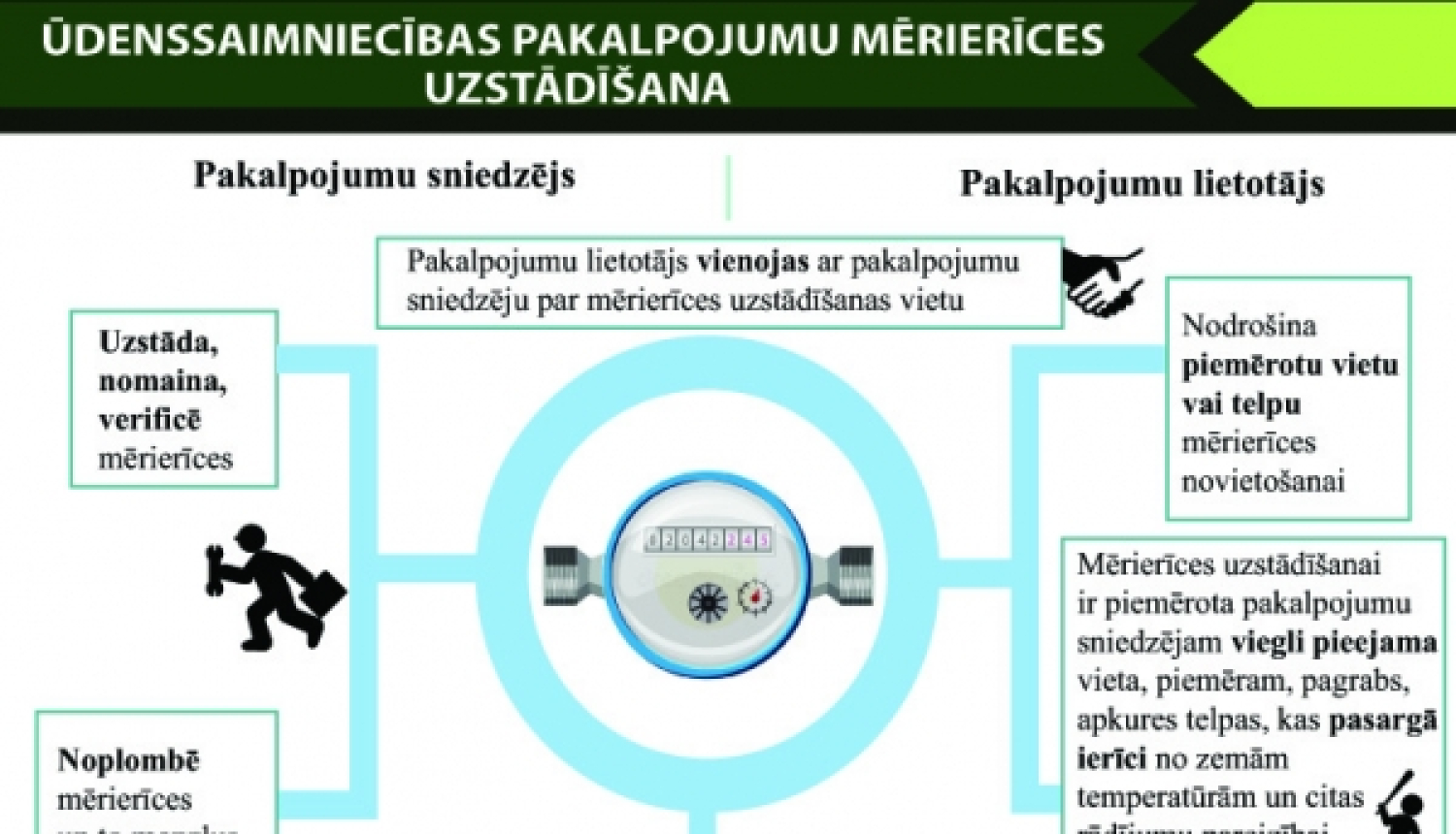 Tāpat SIA “Līvānu dzīvokļu un komunālā saimniecība” attiecīgajās jaunajās kanalizācijas un ūdensapgādes pieslēgumu adresēs izstrādās nepieciešamo tehnisko shēmu, lai iedzīvotājiem būtu skaidra pieslēgšanās vieta tīkliem, izbūves prasības, pieslēguma mezgla tehniskās prasības, kā arī komercuzskaites mēraparāta uzstādīšanas vieta. Vienlaikus informējam, ka atbilstoši Ministru kabineta noteikumiem Nr.174 “Noteikumi par sabiedrisko ūdenssaimniecības pakalpojumu sniegšanu un lietošanu” komercuzskaites mēraparātu uzstāda pakalpojuma sniedzējs par saviem līdzekļiem, bet pakalpojuma lietotājs par saviem līdzekļiem vienīgi uzstāda komercuzskaites mēraparāta mezglu, kur minēto ierīci uzstādīt. Vienalga, kur tiek izvietots mēraparāts, par tā mezgla ierīkošanas darbiem (skatakā, pagrabā vai kādā citā vietā) maksā pakalpojumu lietotāji. Mezgla izbūvi pakalpojuma lietotājs var veikt saviem spēkiem, saskaņā ar izsniegtajiem tehniskajiem noteikumiem. Pakalpojuma sniedzējs (SIA “Līvānu dzīvokļu un komunālā saimniecība”) tikai uzstāda pašu mēraparātu.